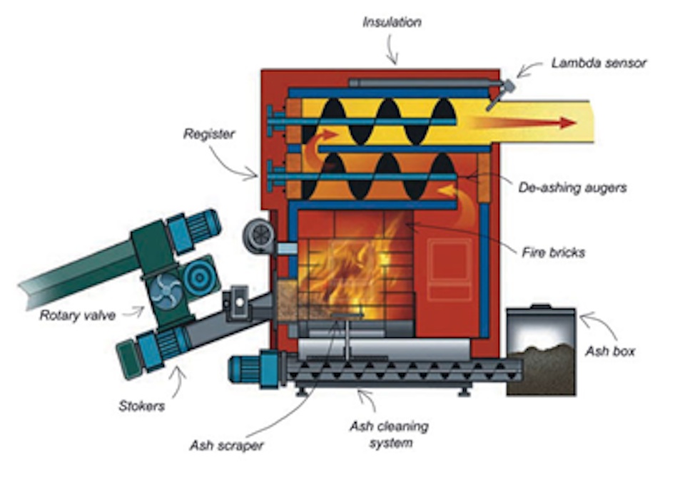 A multi-fuel biomass boiler maintaining high efficiency at partial and peak load outputs with a wide variety of fuels from woodchip to Miscanthus. Utilizing a moving chain-grate ash removal system.